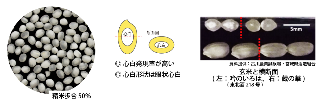 「吟のいろは」は宮城県の気候に合わせて耐冷性、収量性に優れ、大粒で心白発現率が高く、特に眼状心白(心白の形状が眼状)であることが大きな特徴の酒米です。