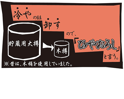 江戸時代にお酒の貯蔵樽からお店へ売る為の小さな酒樽へ火入れをせずにお酒を移した(卸した)ことを指し、「冷えたままお酒を卸す」略して「冷や卸し」という言葉が生まれたそうです。それが現在では、貯蔵タンクでひと夏越させ、旨味と丸みを増したお酒を加熱殺菌せずに生詰めしたものを指すようになり、秋を代表するお酒の代名詞として定着するようになりました。
