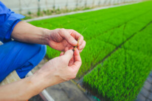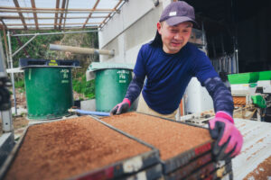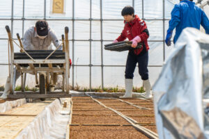 吟のいろはは、酒造好適米ということでお酒専用の米ですが粒が非常に大きいという特性があります。更に吟のいろはについては心白というものが発現するお米ですので、発現率を上げるためには肥沃な土地が大事です。しかし、肥沃な土地だとただ栄養がありすぎることによって稲が倒れてしまったり、そういったリスクがありますのでなるべく最初に入れる肥料を少なめにして生育途中の稲の状況を見て、追肥という後から肥料を追加する作業をします。手間になるのであんまりやる人は少ないですけど、手を掛けてやろうということで追肥を行いました。我々稲が生育しやすい環境を整えてあげるということが大事ですので栽培管理では気を付けています。