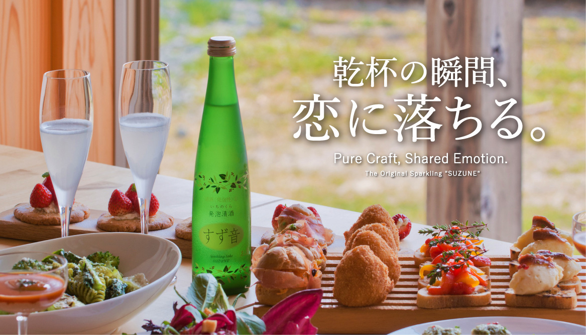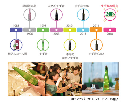 今では一般的となったスパークリング日本酒ですが、「すず音」はそのパイオニアともいうべき存在です。開発の発端は1982年に遡ります。創業者の一人である鈴木和郎(3代目社長)はヨーロッパへ視察旅行に向かいます。パリを訪れると、そこで話題となっていたベルギーのビール、ランビックと出会います。その味わいは、酸味と香りが高いが泡立ちは穏やか。それはまるでワインを彷彿とさせるビールであり、日本人のビールのイメージを覆すものでした。更に、オーストリアのウィーンでは、ぶどう栽培農家が営む居酒屋でホイリゲと出会います。それは醪をしぼったばかりの白ワインで微量の炭酸ガスを含み、取っ手の付いた小型のジョッキで、まるでビールのようにグビグビと楽しむ様子に衝撃を受けたのでした。これらの体験をつうじて、「ビールとワインの間にはすでに垣根はないが、日本酒はまだまだ一口飲めば日本酒と分かる。日本酒もワインやビールと同じ醸造酒なのだから、固定観念にとらわれないもっと多様な造り方、飲み方があってもおかしくない」と強く感じ、帰国後これらの体験から生まれたアイデアもとに、予てより懇意にしていた勇心酒造株式会社の徳山孝社長ともに「ひめぜん」に代表される日本酒らしくない低アルコール酒の開発が始まりました。