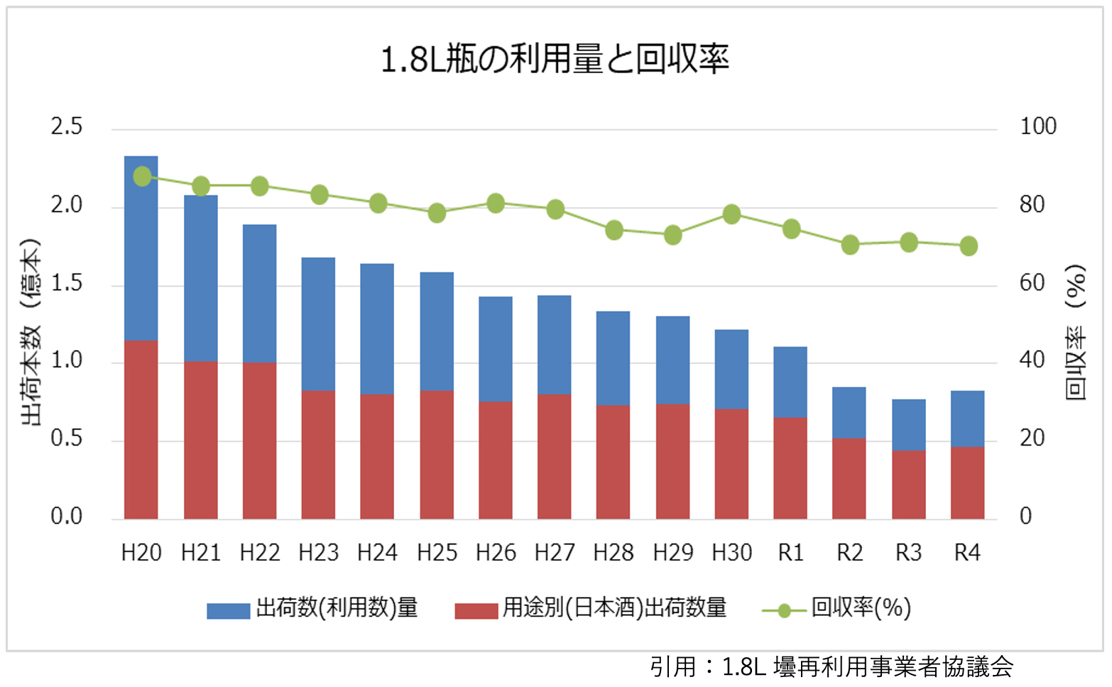 令和5年の時点で、コロナ禍で減少していた日本酒需要の回復と瓶製造大手の工場閉鎖が重なり、瓶の需給逼迫が続いています。人手不足や設備投資の問題から、瓶不足の解消には数年を要するとの見方もあります。商品の瓶色を変更するなど様々な対応が求められる中、瓶のリユース促進も重要度を増しています。