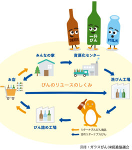 地球温暖化の抑止に向け、リユースというガラス瓶のメリットを最大限に活かしたいところですが、回収システムが追い付かず多くの瓶がリユースされていません。