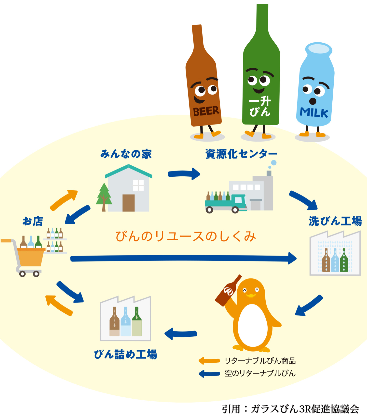 ガラス瓶は、その優れた素材特性からリユース、リデュース、リサイクルからなる3R全てに適応できる環境適性の高い容器だと言われています。他の容器で実現が難しいのがリユースですが、ガラス瓶は割れないかぎり洗浄して繰り返し使うことが出来ます。