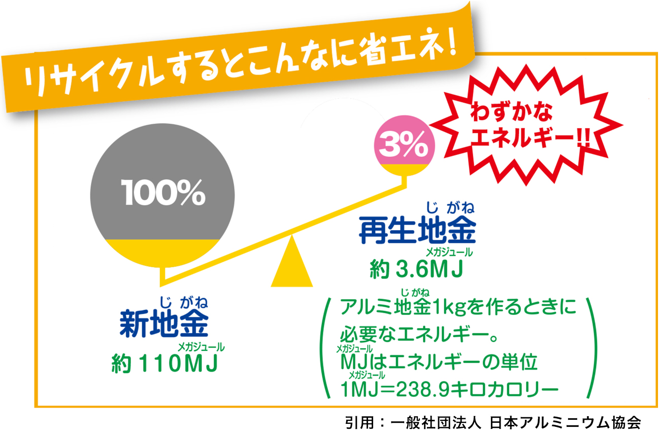 アルミ缶は、原料のボーキサイトから製缶用の新地金がつくられますが、精錬をはじめとする製造工程には非常に多くの電力を使います。一方、アルミ缶はリサイクルが容易な容器としても知られていて、回収後に選別、溶解されて再生地金となり、新地金と混ぜて再びアルミ缶に戻ります。アルミ缶を再生することで精錬に使用する電力を省くことができるため、アルミ缶のリサイクルによる省エネルギー効果は非常に大きいとされています。