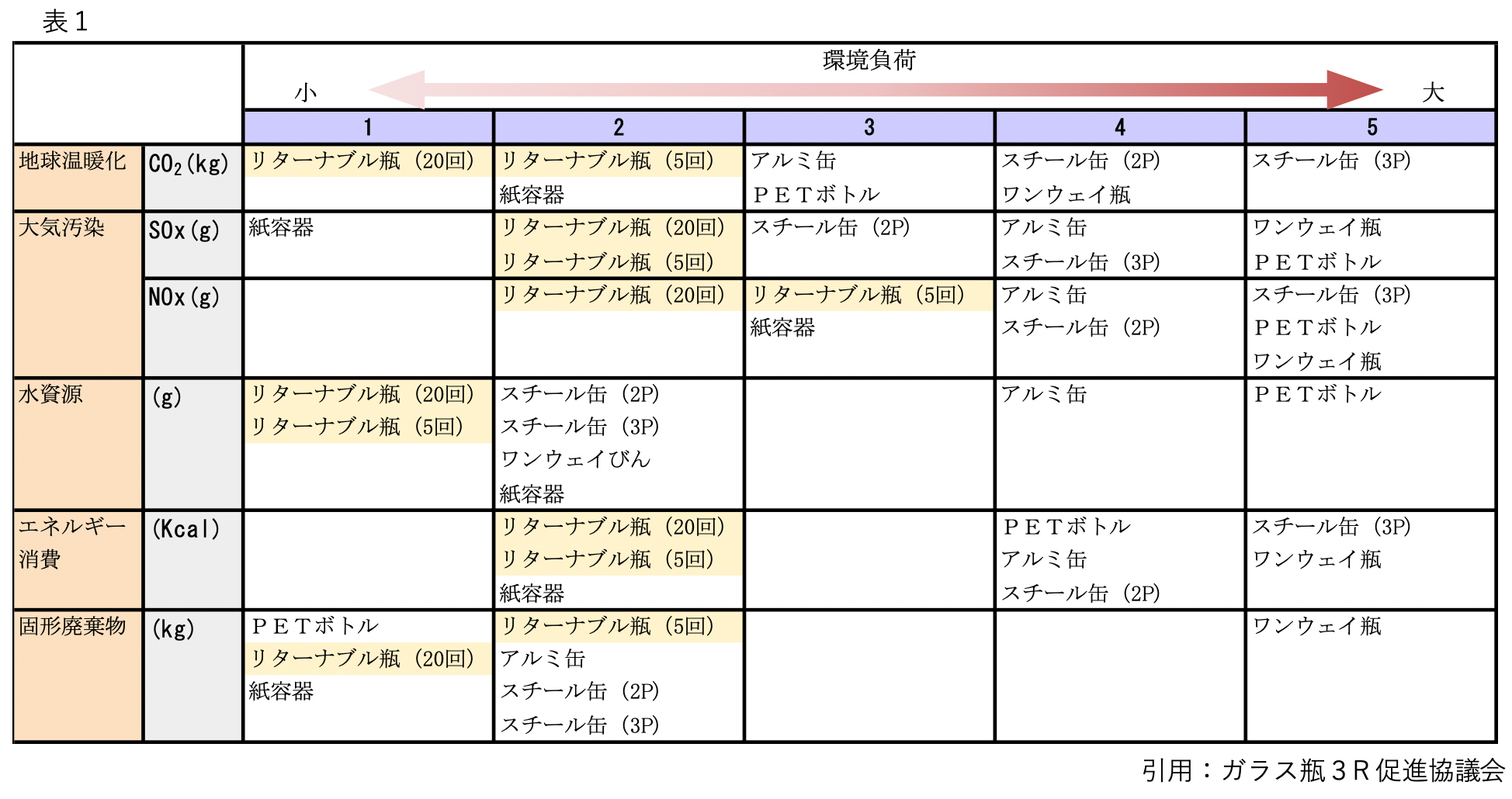 地球温暖化に関与する二酸化炭素の排出が最も少ないのは、瓶をリユースした時であり、リユース回数が多いほど排出量は少なくなります。(表1) 二酸化炭素以外の項目を見ても、リユース瓶は環境負荷が小さいことが分かります。一方、ワンウェイ瓶は環境負荷が大きい位置に、アルミ缶はほぼ中間に位置しています。