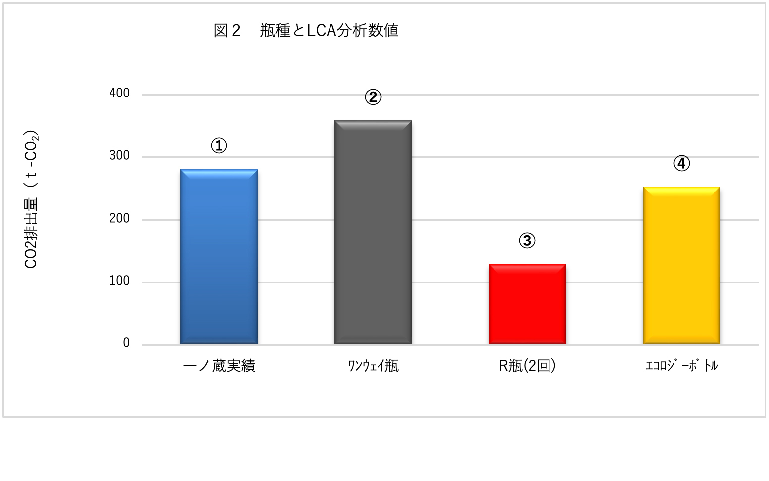 改めて、一ノ蔵の実績(※2)を引用し、瓶の種類とLCAの関係を調べてみました(図2)。 一般的なワンウェイ瓶はR瓶よりも重く、リユースも想定していないため、二酸化炭素排出量が多いことが分かりました。リユース回数2回のR瓶は、一ノ蔵の実績や環境に配慮したエコロジーボトル(※3)の排出量を大きく下回りました。