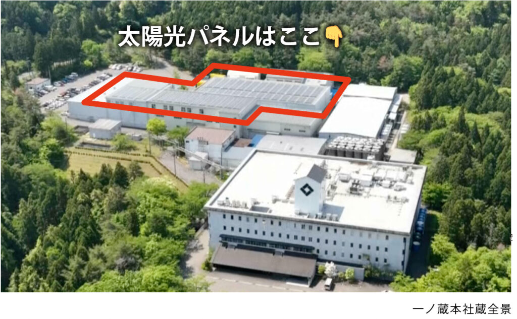 一ノ蔵では、松寿蔵の屋上に太陽光パネルを設置し、2013年から太陽光発電を行っています。 ここで発電された電気を自社で使用することはありませんが、その発電量は本社蔵棟の年間電気使用量の1割に近づいています。