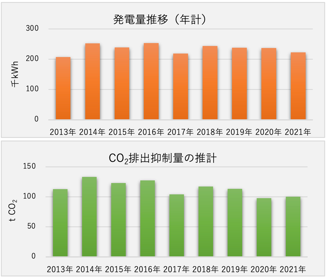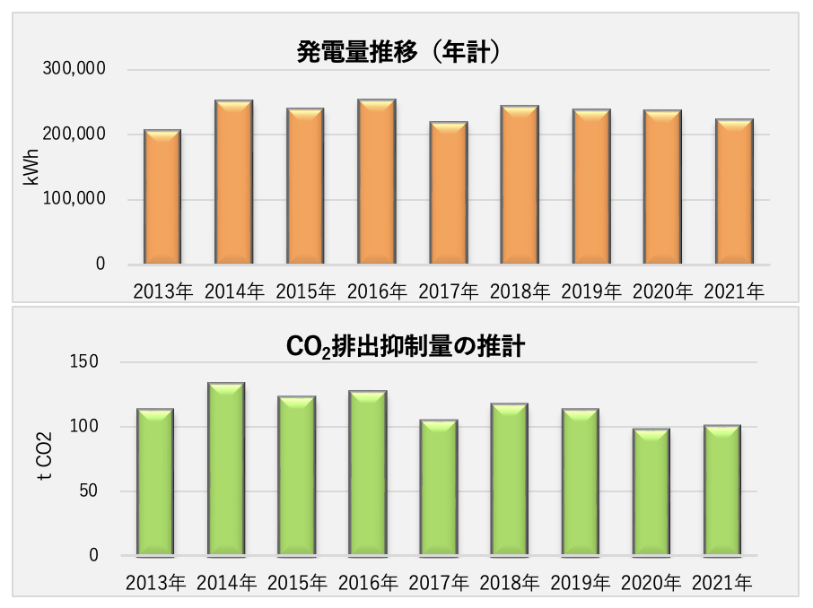 2016年に一ノ蔵が使用した電力量は280万8,215kwh/年。同じく、太陽光で発電した発電量は25万3,192kwh/年でした。この発電量は、本社蔵棟と製品課棟の電灯で使用する年間の電力量に相当します。太陽光発電は、発電時に二酸化炭素などの温室効果ガスを排出しません。2013年~2021年に、一ノ蔵が太陽光発電を行うことで排出が抑制された二酸化炭素は約1,030tになります。