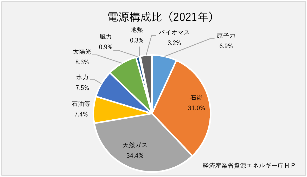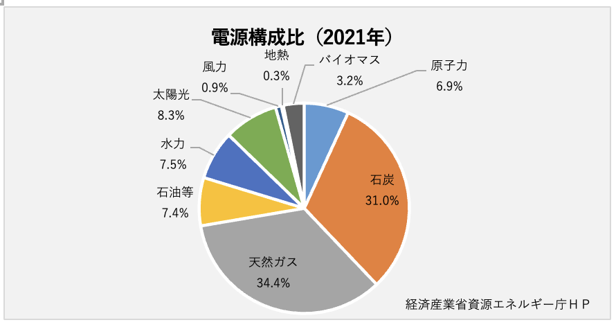 日本国内の全発電量を電源別にみてみると、発電時に二酸化炭素を排出しない再生可能エネルギー発電の占める割合は20.3%。 同じく原子力発電は6.9%です。