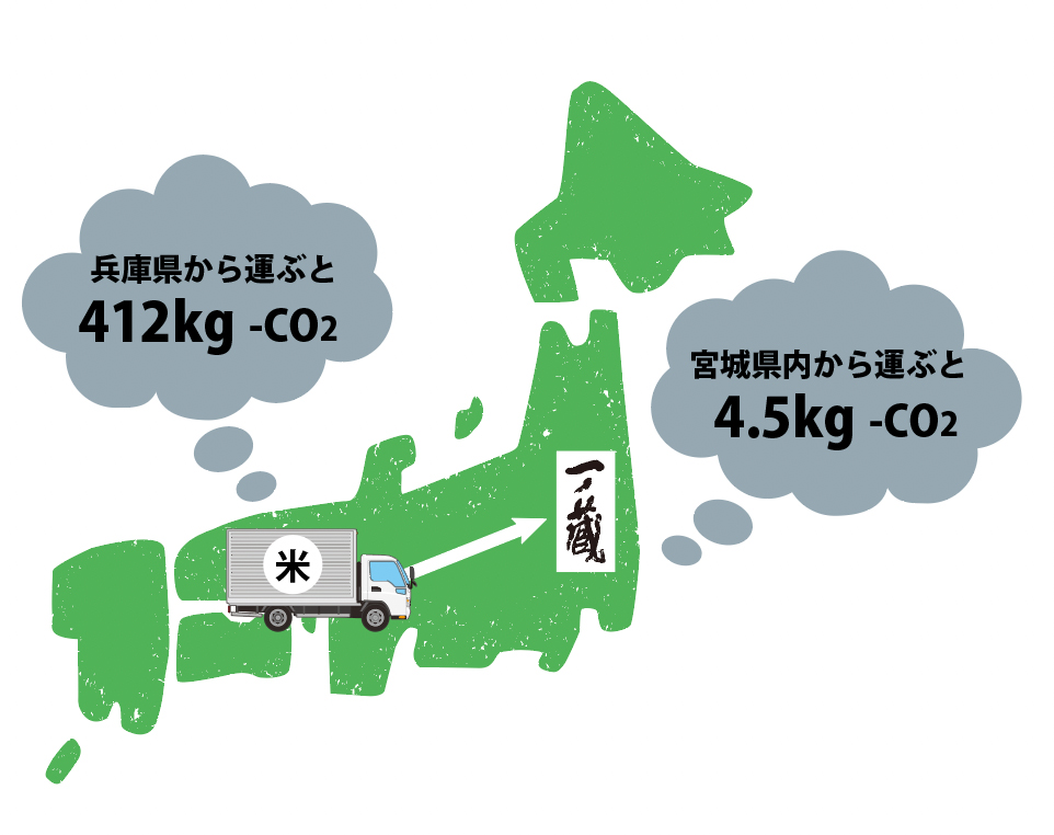 現在、一ノ蔵が酒造りに使用している米の9割以上は宮城県産米です。積極的に地元のお米を使用する目的は地域農業の振興にほかなりませんが、SDGsの観点で見直すと、輸送距離が短いことによって、輸送費の削減や輸送時に排出される温室効果ガスの削減につながっていることを再認識します。輸送費の削減はさておき、日常ではなかなか知ることができない温室効果ガスの排出削減について試算してみました。
