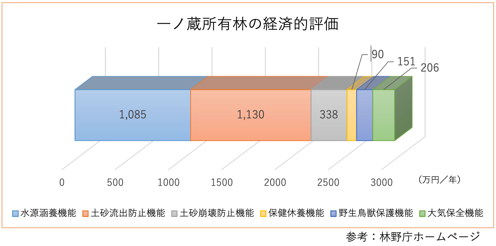 一ノ蔵では、“里山活動”と称して本社蔵周辺の里山を整備し、お酒造りに重要な水源を確保しています。林野庁の取り組みを参考に、一ノ蔵の所有林がどれくらいの価値を持つのか計算してみました。