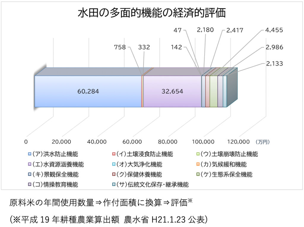 一ノ蔵で1年間に使用する原料米の数量から水田の作付面積を算出し、水田の多面的機能を貨幣評価したところなんと約11億円にも上ることが分かりました。