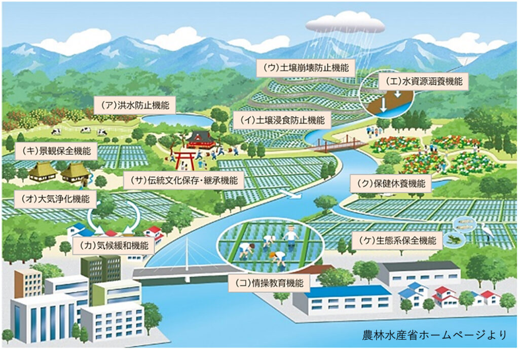 かつて、田んぼは地球温暖化の原因となるメタンガスの主要な発生源と言われ、稲作そのものが否定的に見られていた時代がありました。その後、農業と環境の関連について詳細な調査が行われたことで、田んぼは様々な役割を持っていることが分かりました。それらは水田の多面的機能と呼ばれています。