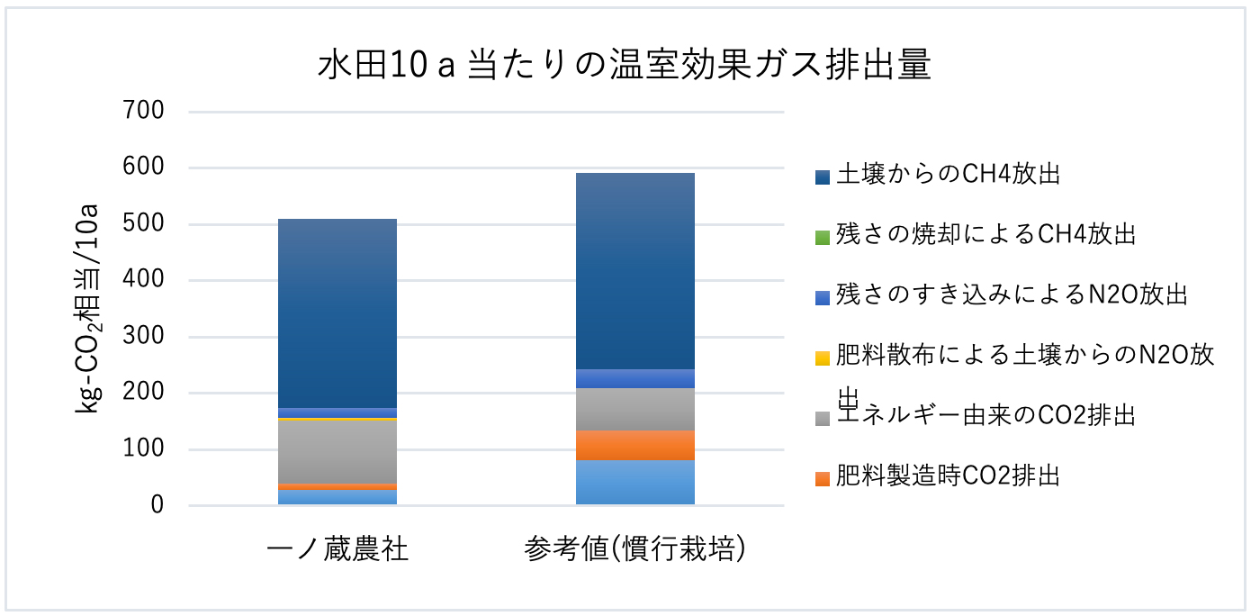 一般的な慣行栽培と一ノ蔵農社で取り組んでいる環境保全型農業で、温室効果ガスの排出量に違いがあるのか、ライフサイクルアセスメント(※1)という分析法で、米の生産現場で排出される温室効果ガスの量を比べてみました。