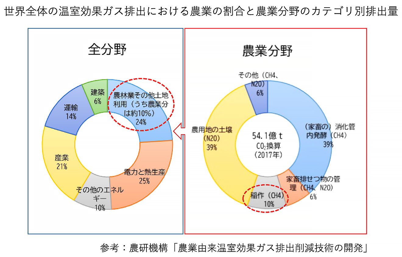 地球温暖化は、私たちの生活に大きな影響を与える問題です。地球全体の温室効果ガスの排出量を産業別に見ると約24%が農林業活動に由来し、そのうち農業分は約10%を占めています。酒造りとは切っても切れない稲作からも、多くの温室効果ガスが排出されています。