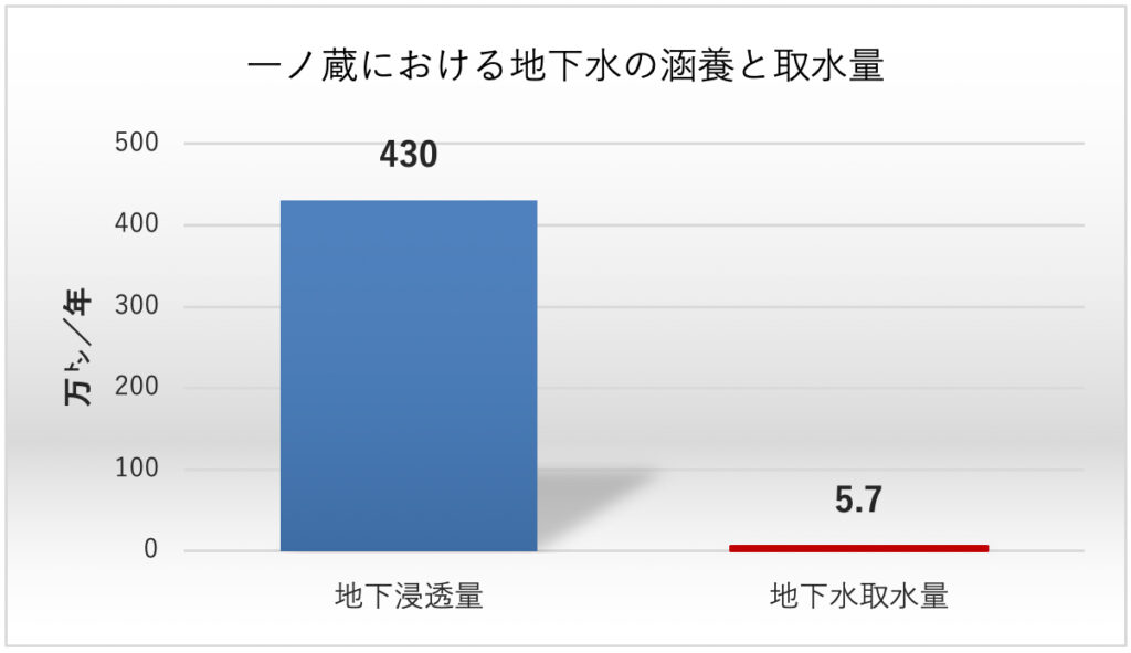 グラフが示すように、酒造りをとおして見込まれる地下浸透量は、一ノ蔵が取水した地下水量を大きく上回っていることが分かりました。これは、一ノ蔵が使った地下水を直接補充するものではありませんが、水田から地下に浸透した水は下流の地域で揚水され、生活用水や工業用水として活用されます。