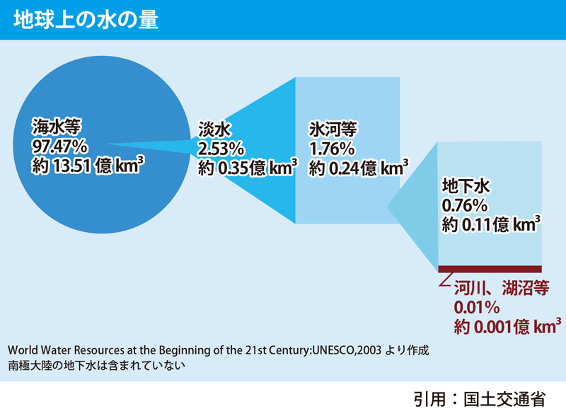 地球は水の惑星と呼ばれ、表面の3分の2が水で覆われています。その量は14憶k㎥と言われていますが、大部分は海水で、淡水は全体の2.5%程度に過ぎません。しかも、河川や湖沼など人が利用しやすい状態で存在する水はわずか0.01%(0.001億k㎥)しかありません。水は生命にとって必要不可欠です。人間活動は自然の水循環に対して少なからず影響を及ぼしているため、人類および生態系が水の恵みを持続的に享受できるよう、水資源を適切に利用していくことが重要だと言われています。