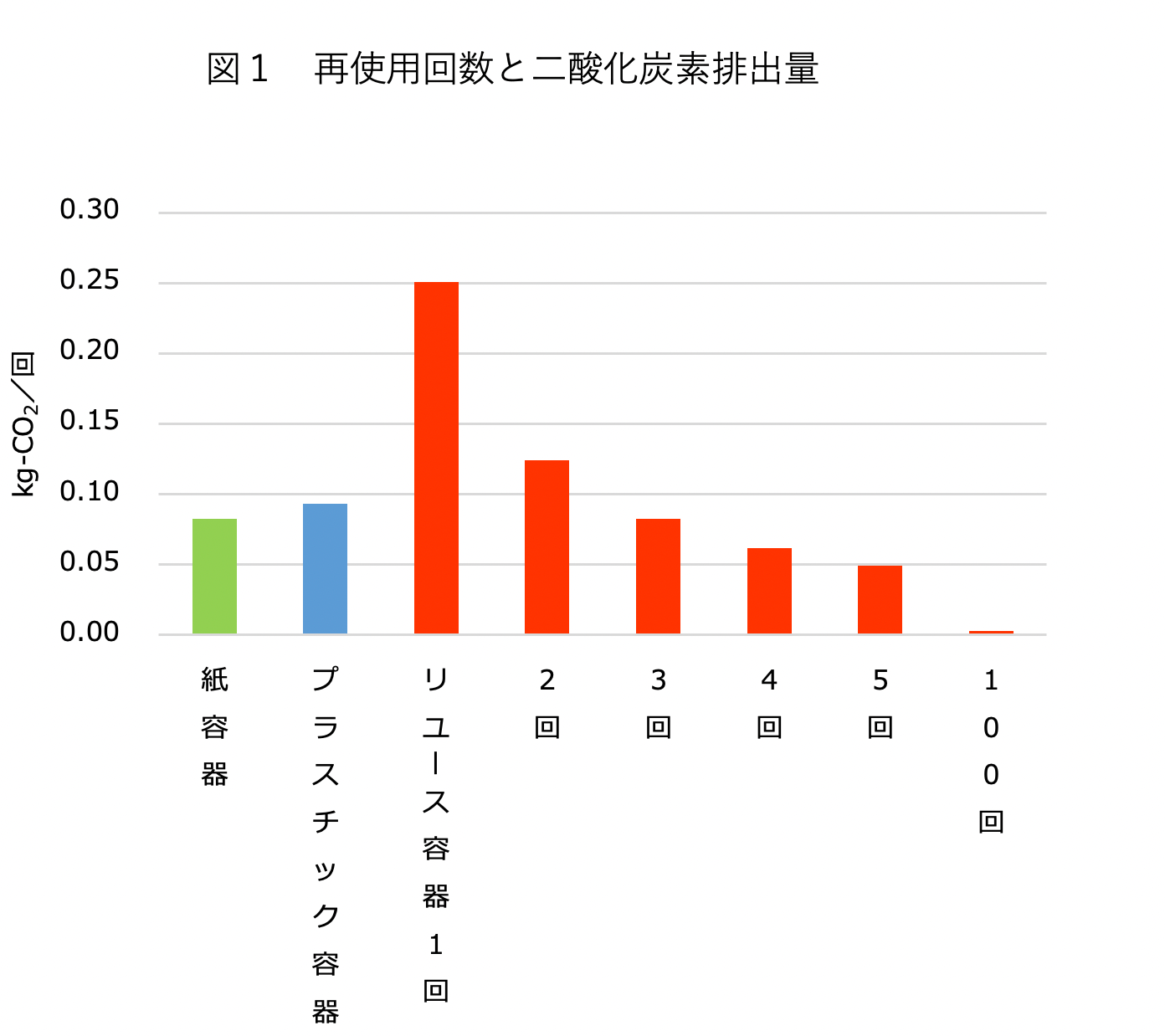 一般的に、プラスチック容器のうち再使用されるものは耐久性が求められるため、使い捨て容器よりも原料の使用量が多いなどライフサイクルで排出される二酸化炭素が多いと言われています。ただし、繰り返し使用すると、使い捨てされるプラスチック容器よりも二酸化炭素の排出量が下回ると考えられています(※3)。