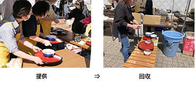 一ノ蔵は、平成15年より蔵開放をはじめとする各種イベントで使い捨て容器の使用を止めました。替わりに、再使用できるプラスチック容器(お椀870個、お皿3000枚、箸2500膳)などを購入し、例えば、出店業者様にもご協力をいただくなど、会場全体で使い捨て容器の削減に取り組んでいます。
