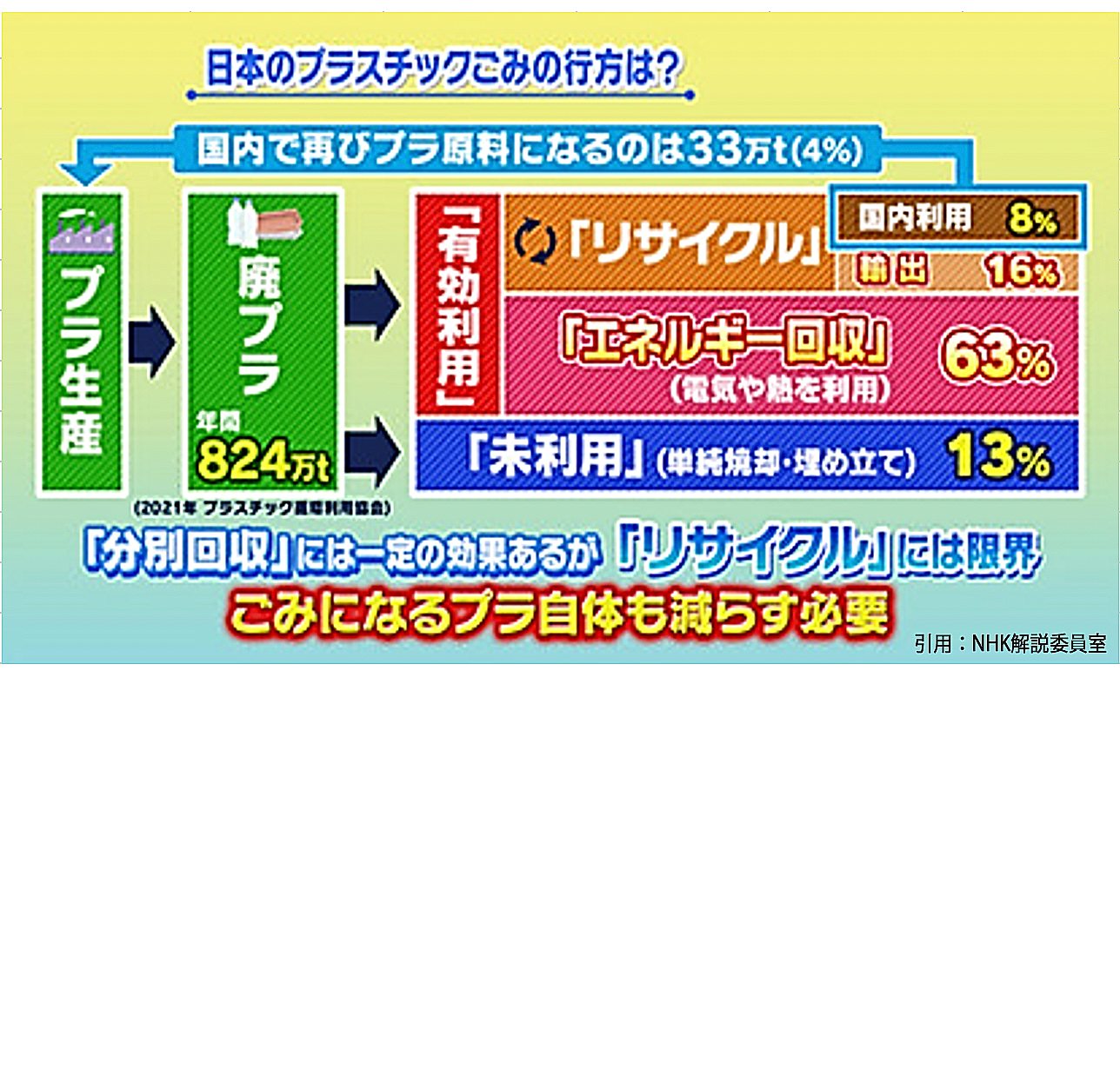 LCAとあわせて、16回分のプラスチックごみの削減も非常に重要なポイントです。日本のプラスチックごみのリサイクル率は24%ほどで、大半は燃やして発電や熱利用に使われ、13%は未利用のまま焼却、あるいは、埋め立てにより処分されています。国内で再びプラスック原料となる割合はわずかに4%。プラスチックのリサイクルには、費用やエネルギーがかかる、品質が劣るなどの課題もあり、リサイクルに頼る対策には限界もあると言われています。